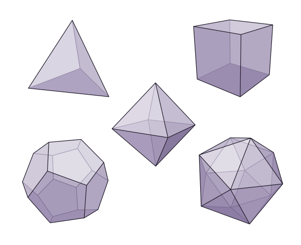 Tetrahedron – 4 triangular faces Cube (Hexahedron) – 6 square faces Octahedron – 8 triangular faces Dodecahedron – 12 pentagonal faces Icosahedron – 20 triangular faces